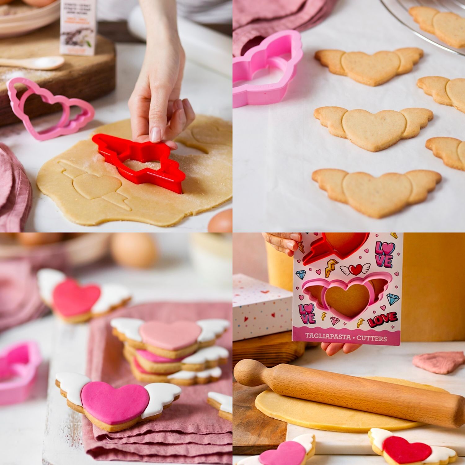 Set compuesto por 2 diseños románticos: un corazón con alas y un corazón flechado. Un conjunto perfecto para crear galletas y pequeñas elaboraciones con un toque original y lleno de cariño.