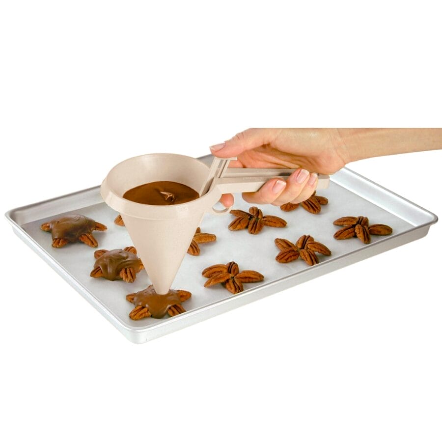 Práctico embudo de dosificación para fundidos líquidos de chocolate, caramelo, o similares.