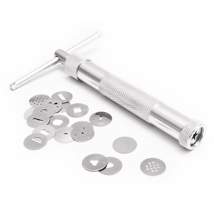 Extractor de pasta de azúcar de aluminio, junto con 20 discos con distintos patrones de acero inoxidable.