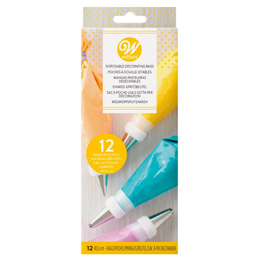 Set de 12 mangas pasteleras desechables Wilton, hechas de plástico fuerte y flexible.