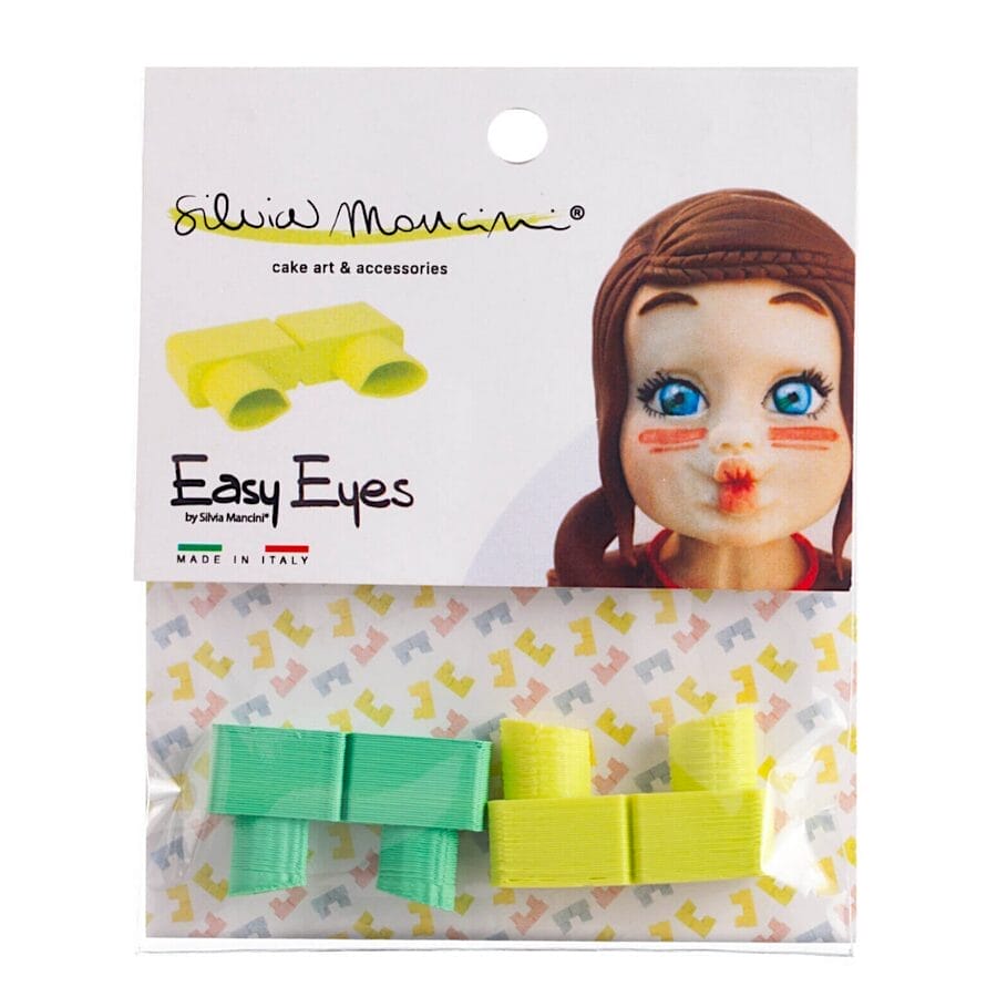 Primero debe hacerse la nariz, y colocar el EasyEyes en el centro de la misma, presionando ligeramente. Una vez hemos dejado la marca de los ojos en nuestra figura, podemos pintar directamente el ojo perfeccionando los bordes, o bien, quitar el exceso de pasta y reemplazarla por una pequeña cantidad de pasta de azúcar blanca, que simulará la parte blanca de los ojos.