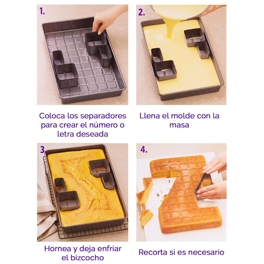 Con las diferentes piezas sueltas puedes diseñar la letra o número que desees. Colócalas en el molde formando la letra que necesites, rellénalo con la masa y hornéalo.