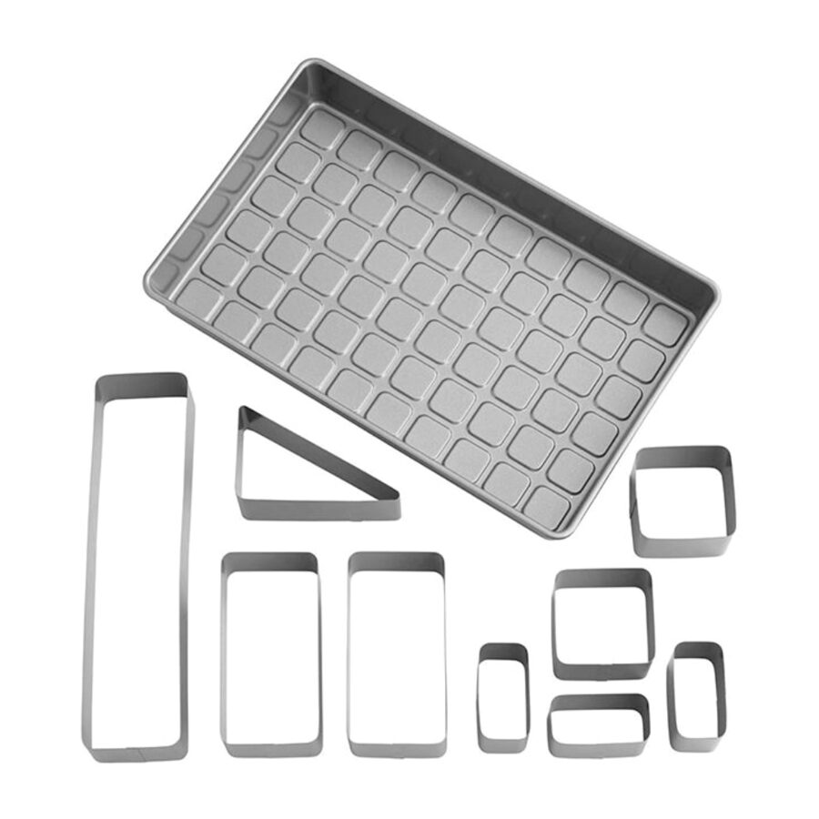 Medidas: Molde 38 x 23 x 5 cm – Piezas sueltas: 7 x 3,5 x 5 cm (3x) / 7 x 7 x 5 cm (2x) / 14 x 6,5 x 5 cm (2x) / 28 x 6,5 x 5 cm (1x) / 13,5 x 6 x 5 cm (1x).