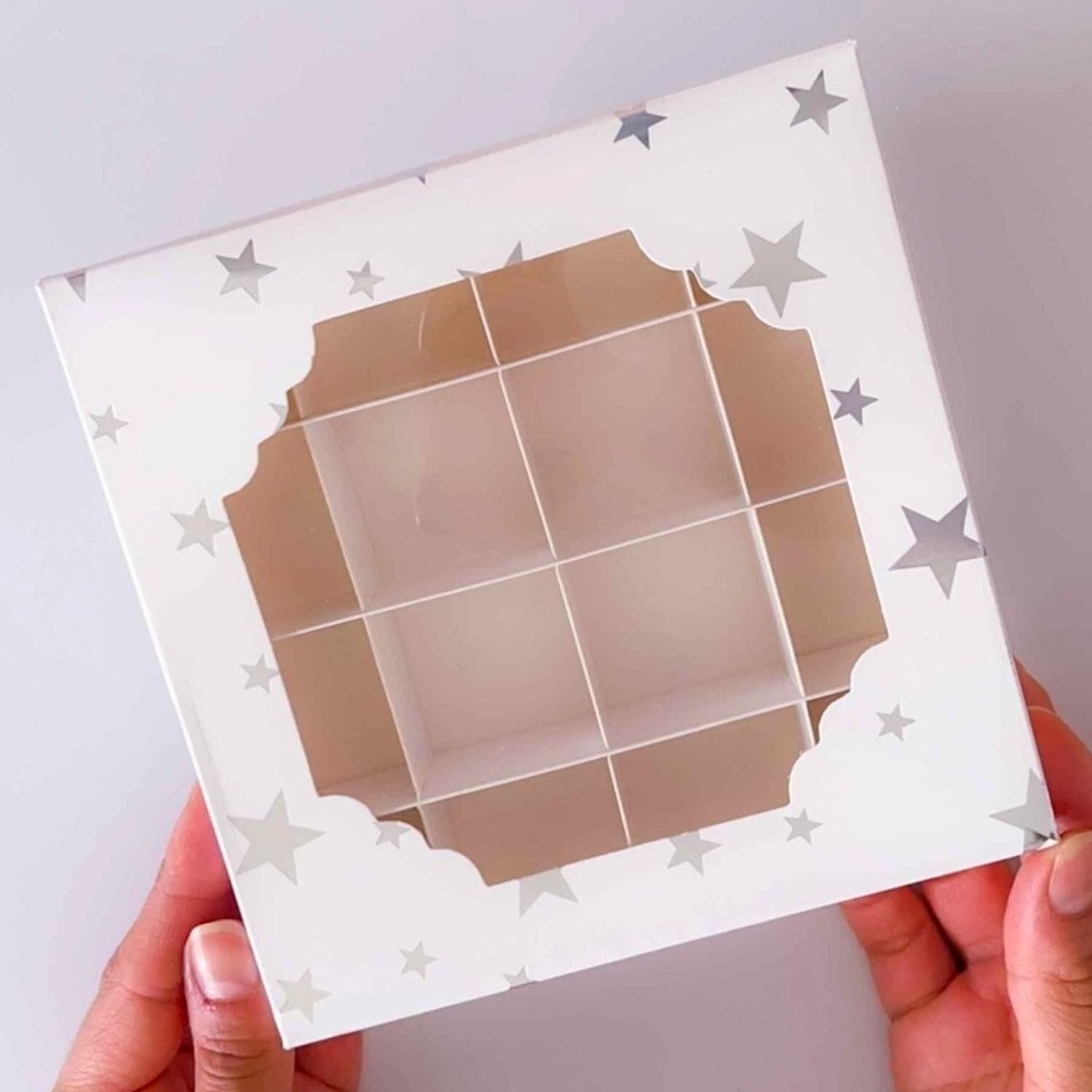 Gracias a sus 16 compartimentos, tus dulces se mantienen en su lugar, evitando movimientos y garantizando una presentación ordenada y elegante. La tapa con ventana transparente permite mostrar tus productos, resaltando su belleza y atrayendo la atención de quienes los reciban o los compren.