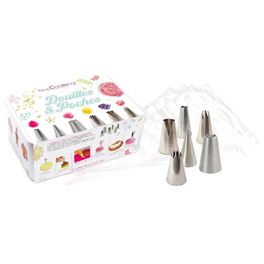 Incluye 6 boquillas de acero inoxidable + 8 mangas pasteleras de Scrapcooking, ¡el set perfecto para decorar!