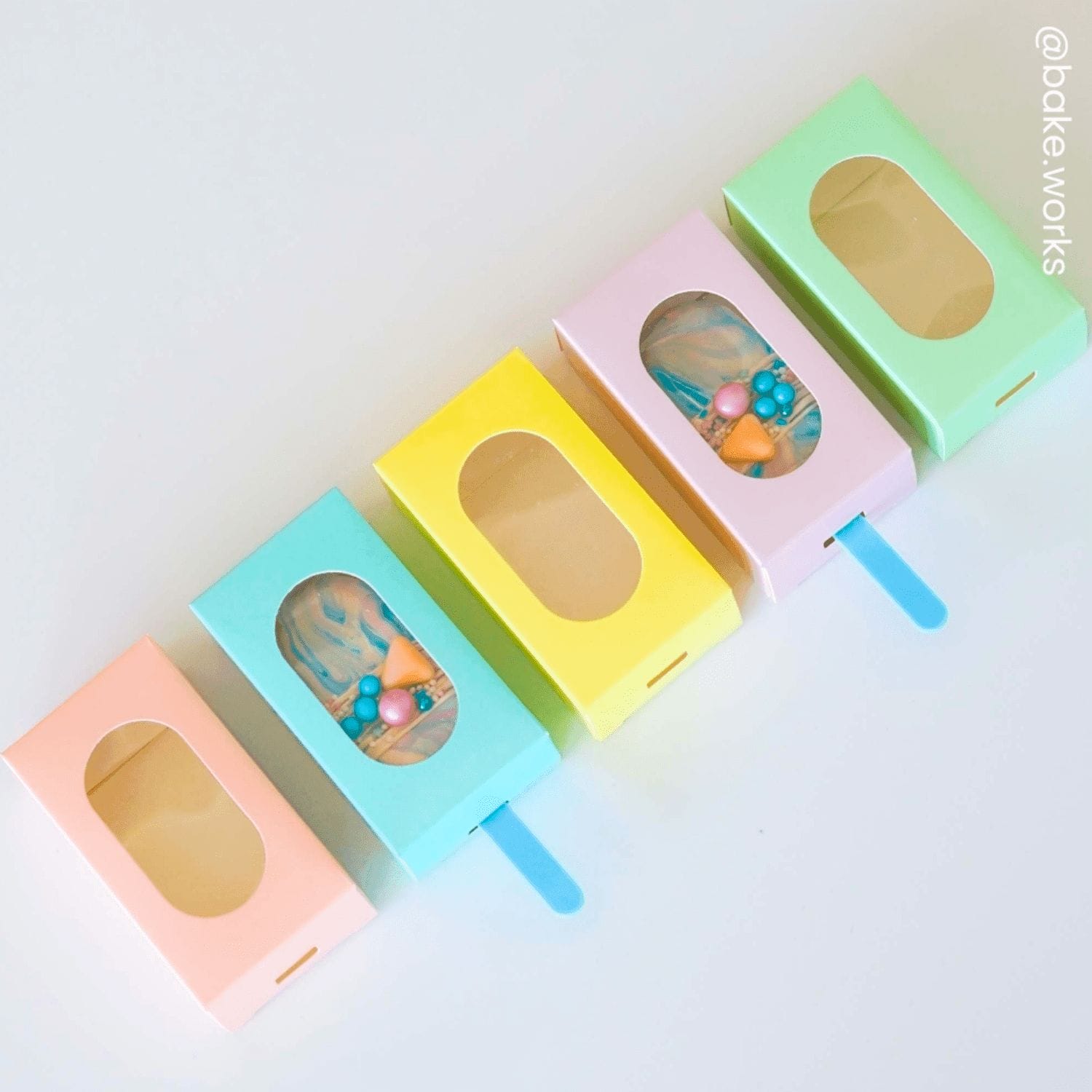 Cada caja tiene capacidad para 1 helado ("cakeslice"), lleva una ventana en la parte superior para poder ver su contenido con facilidad y cuenta con un orificio en la parte inferior para el palo del helado.