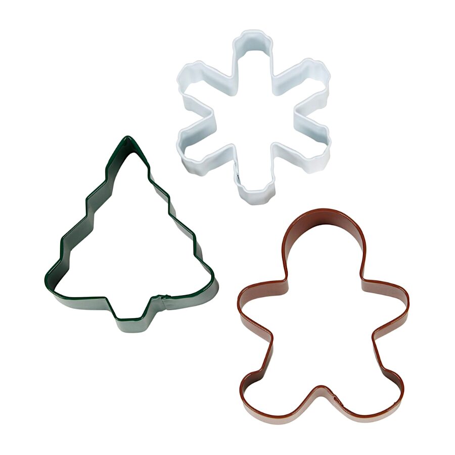 El set contiene 3 cortadores con forma de abeto, copo de nieve y muñeco de jengibre.