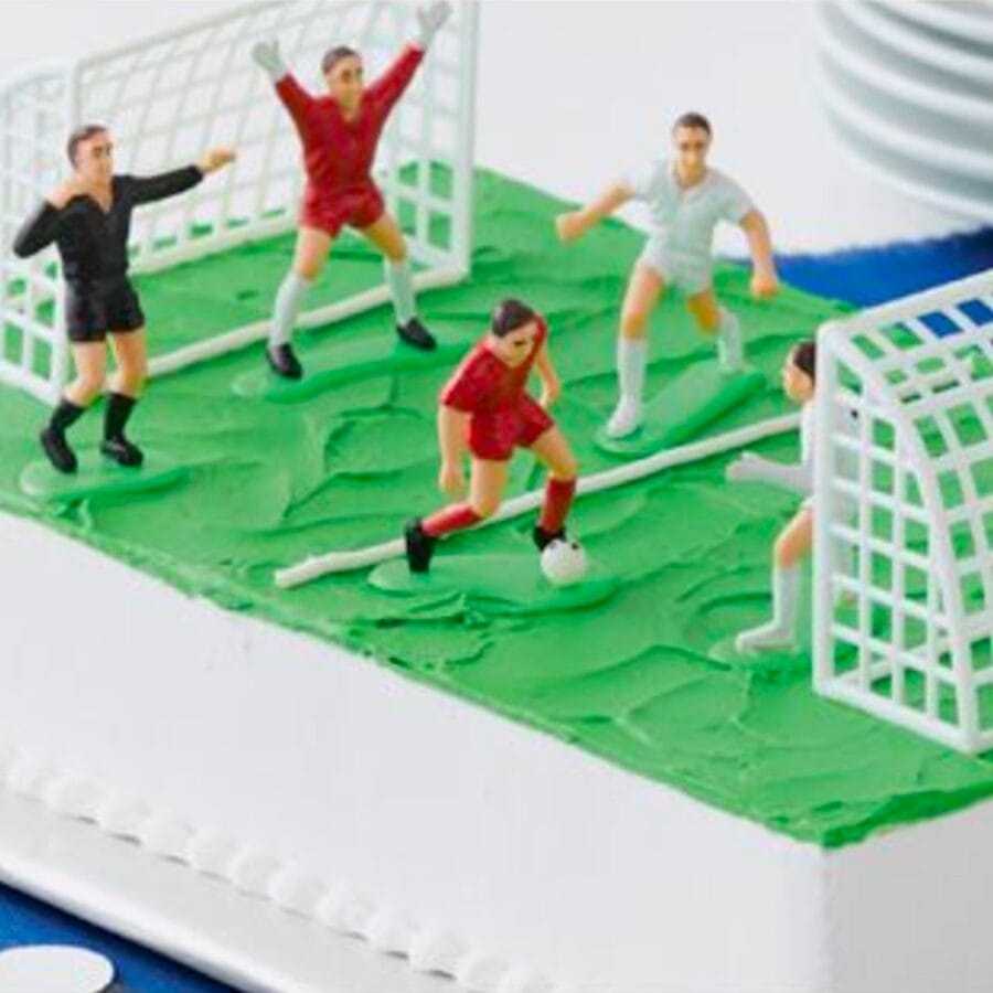 Incluye 5 futbolistas y 2 porterías. Decoración no comestible ideal para los apasionados del deporte.