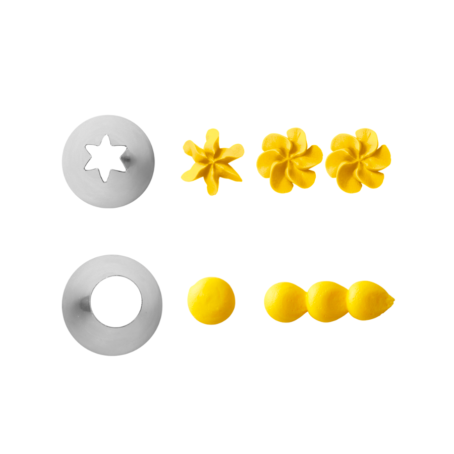 Incluye 1 acoplador tricolor de plástico, 2 boquillas de acero inoxidable (1M y 1A) y 6 mangas pasteleras desechables.