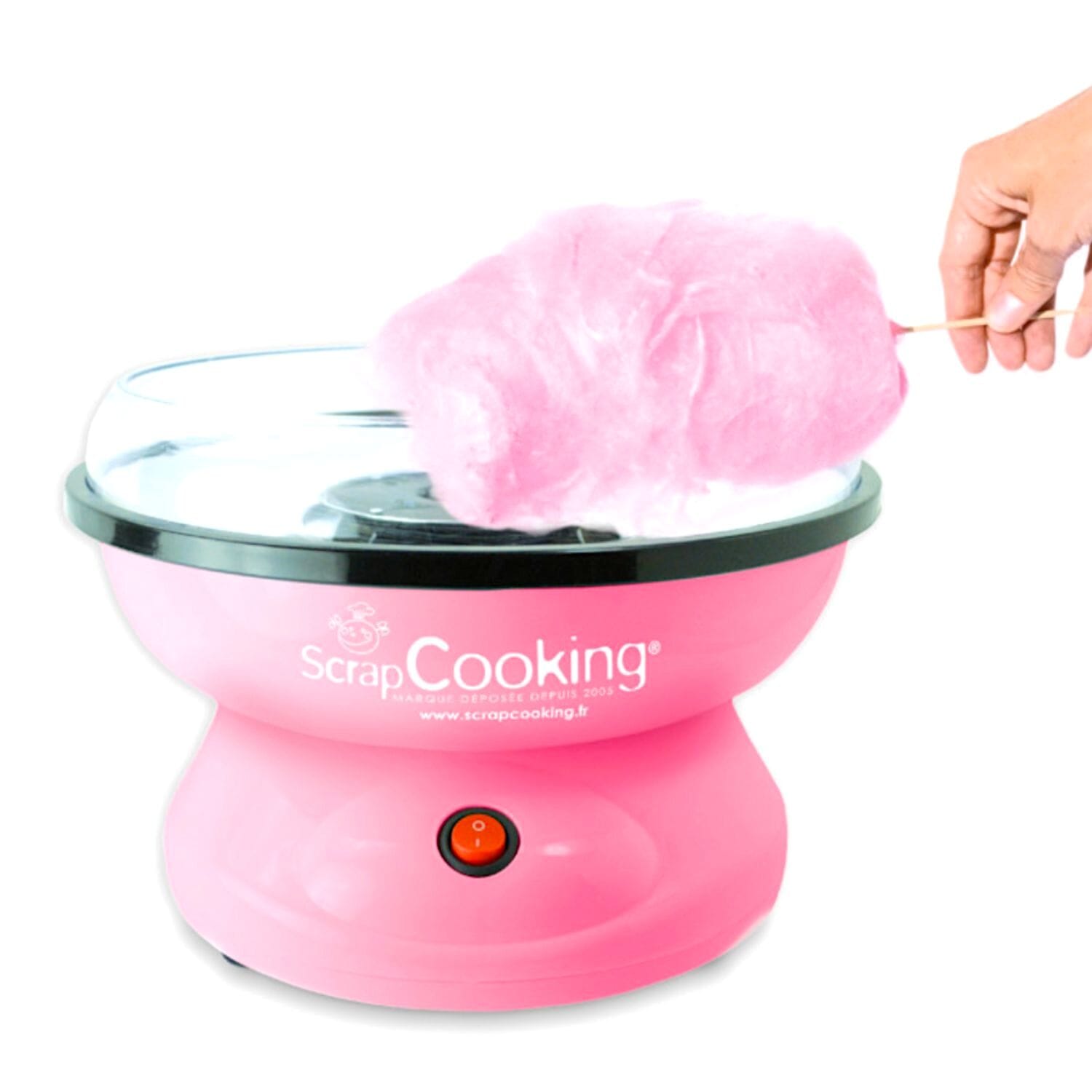 Fantástico set para hacer nuestro propio algodón de azúcar, incluye: 1 kg de algodón de azúcar color rosa con delicioso sabor a fresa de la marca Pastkolor, 60 palitos de madera y una máquina para hacer algodón de azúcar de la marca Scrapcooking con accesorios.