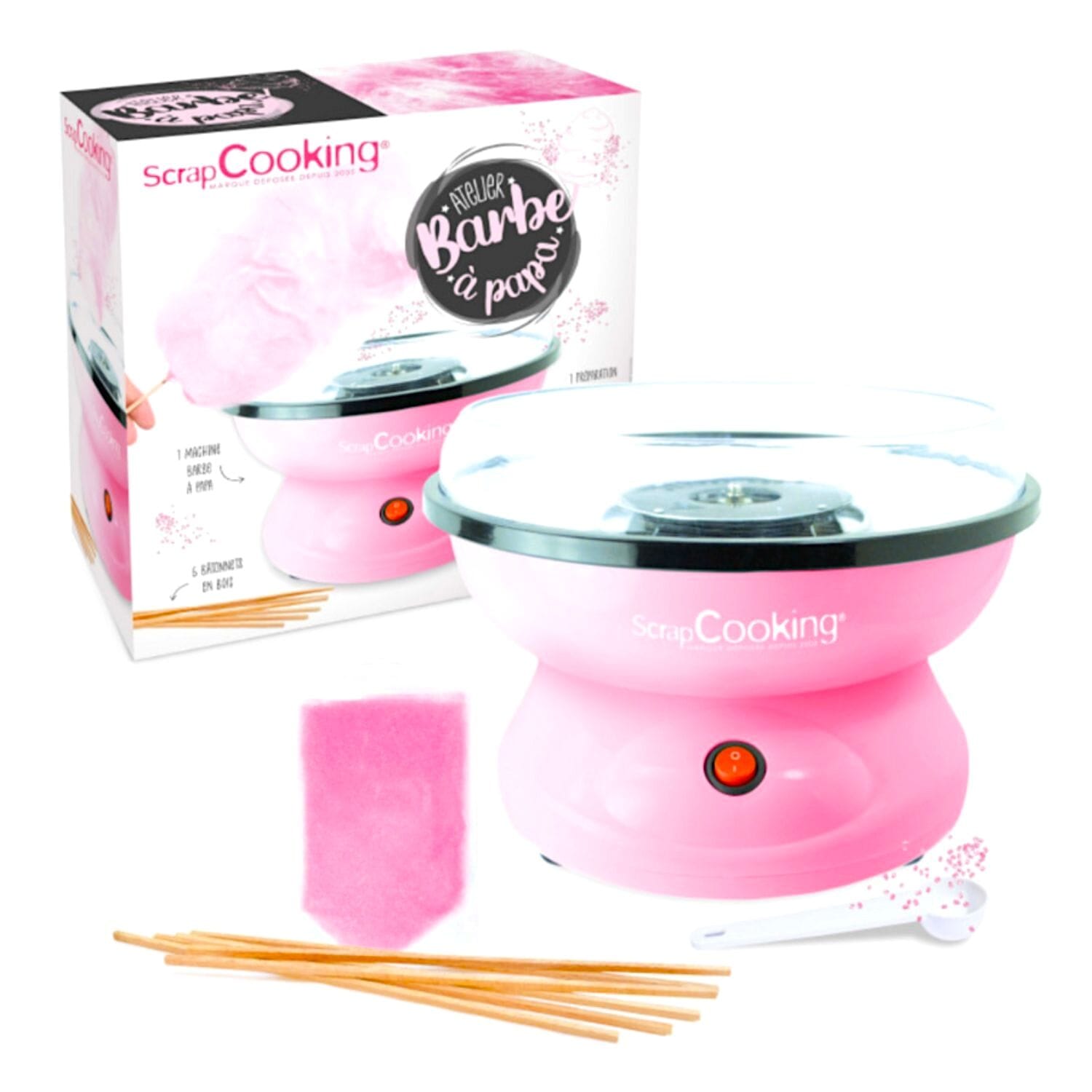 El set incluye: 1 bote de algodón de azúcar color rosa Pastkolor (1 kg) + 60 palitos de madera + máquina de algodón de azucar Scrapcooking (1 máquina + instrucciones + 1 cuchara medidora + 6 palitos de madera reutilizables + 100 g de algodón de azúcar rosa para hacer hasta 12 piezas de algodón).
