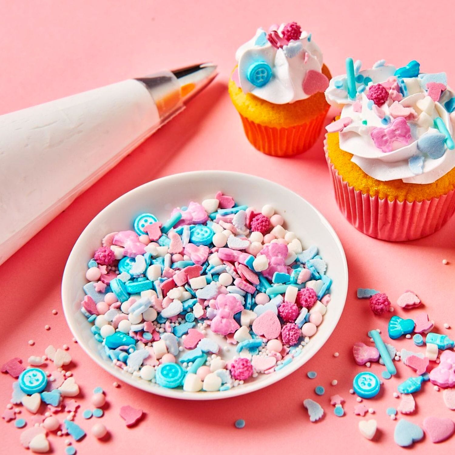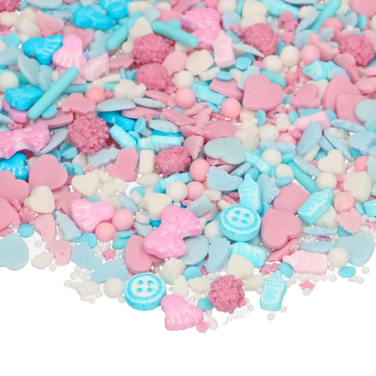 La mezcla de decoraciones incluye figuras en 3D (pies, botones, lazos, biberones, corazones), body de bebé, estrellas, perlas, nonpareils, mimosas y palitos de azúcar XL.