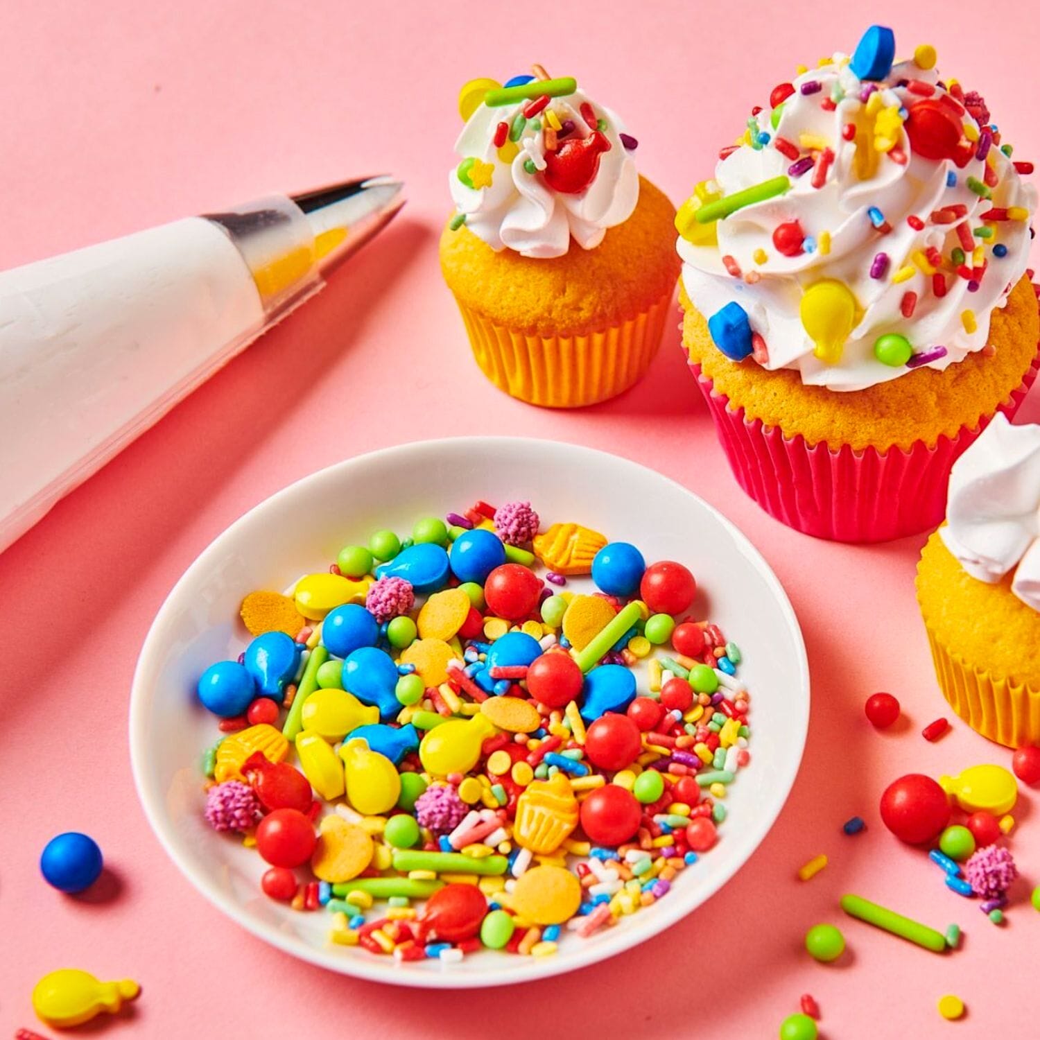 La mezcla de decoraciones incluye figuras en 3D (cupcakes y globos), bolas, perlas, estrellas, mimosas, fichas planas y palitos de azúcar.