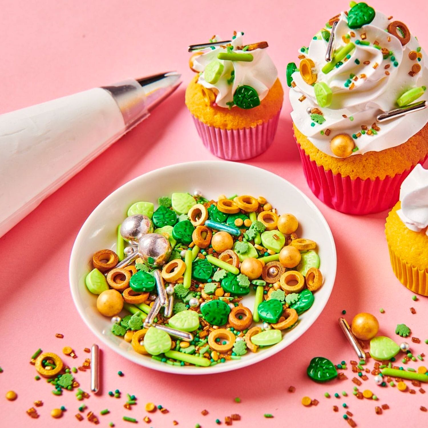 La mezcla de decoraciones incluye figuras en 3D (hojas y aros), bolas, perlas, nonpareils, fichas planas, palitos de azúcar pequeños y XL.