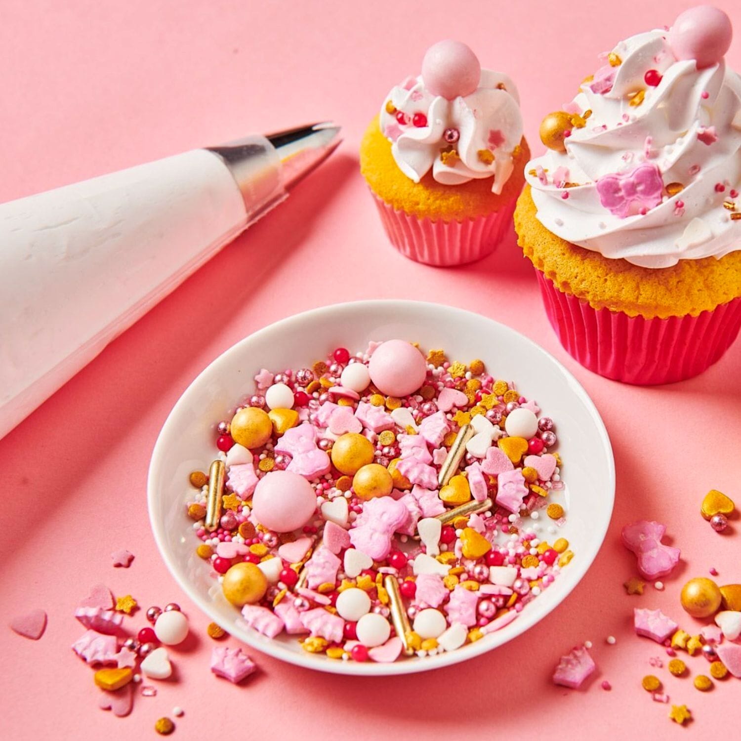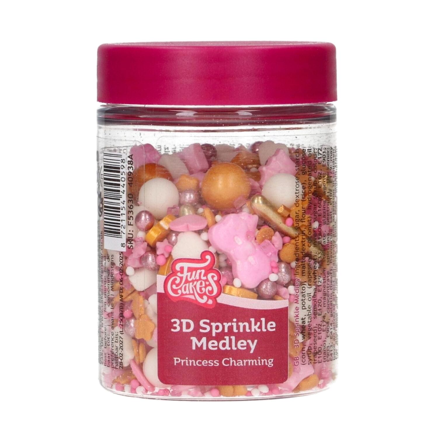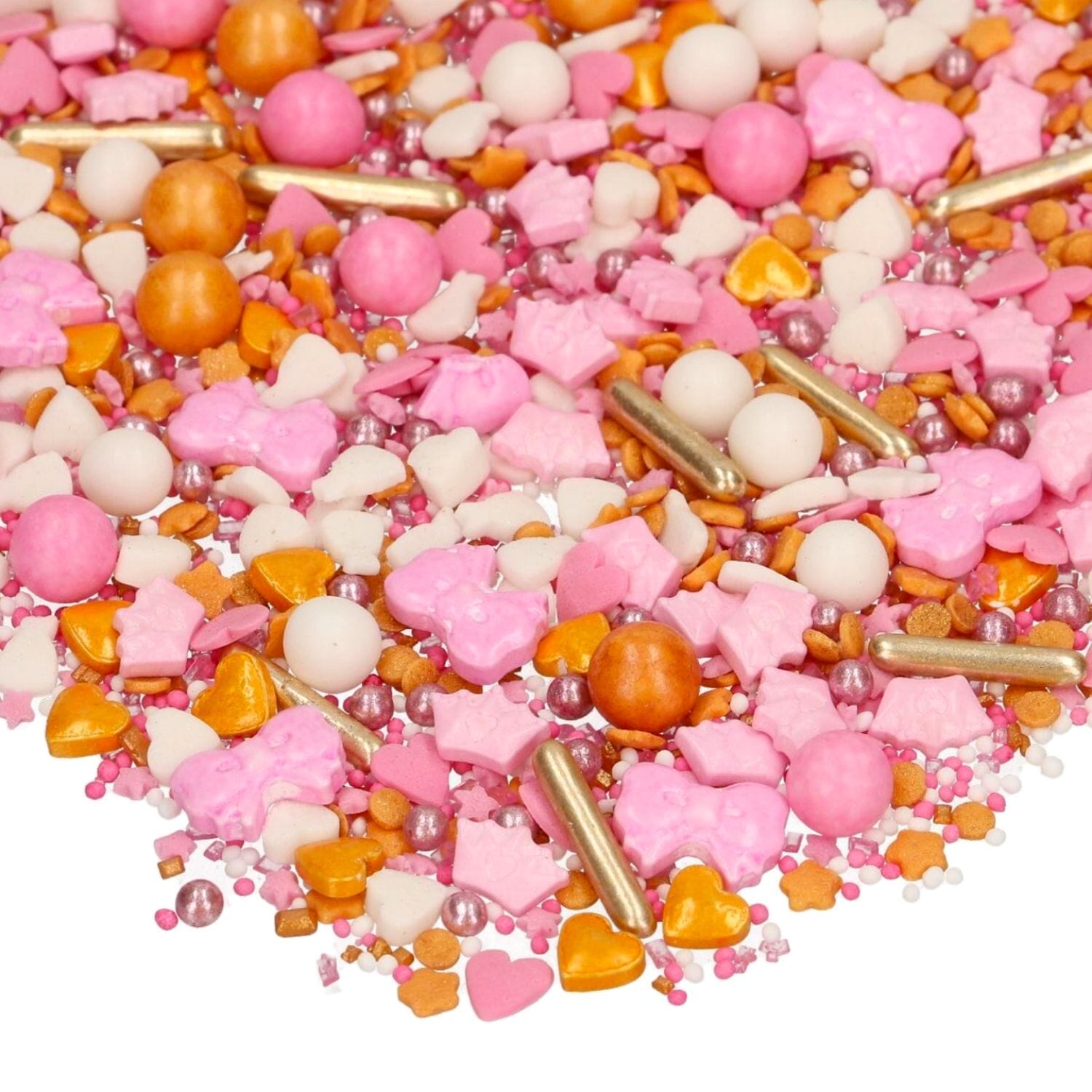La mezcla de decoraciones incluye figuras en 3D (coronas, corazones y lazos), bolas, perlas, nonpareils, estrellas, vestidos de princesas, fichas planas y palitos de azúcar XL.