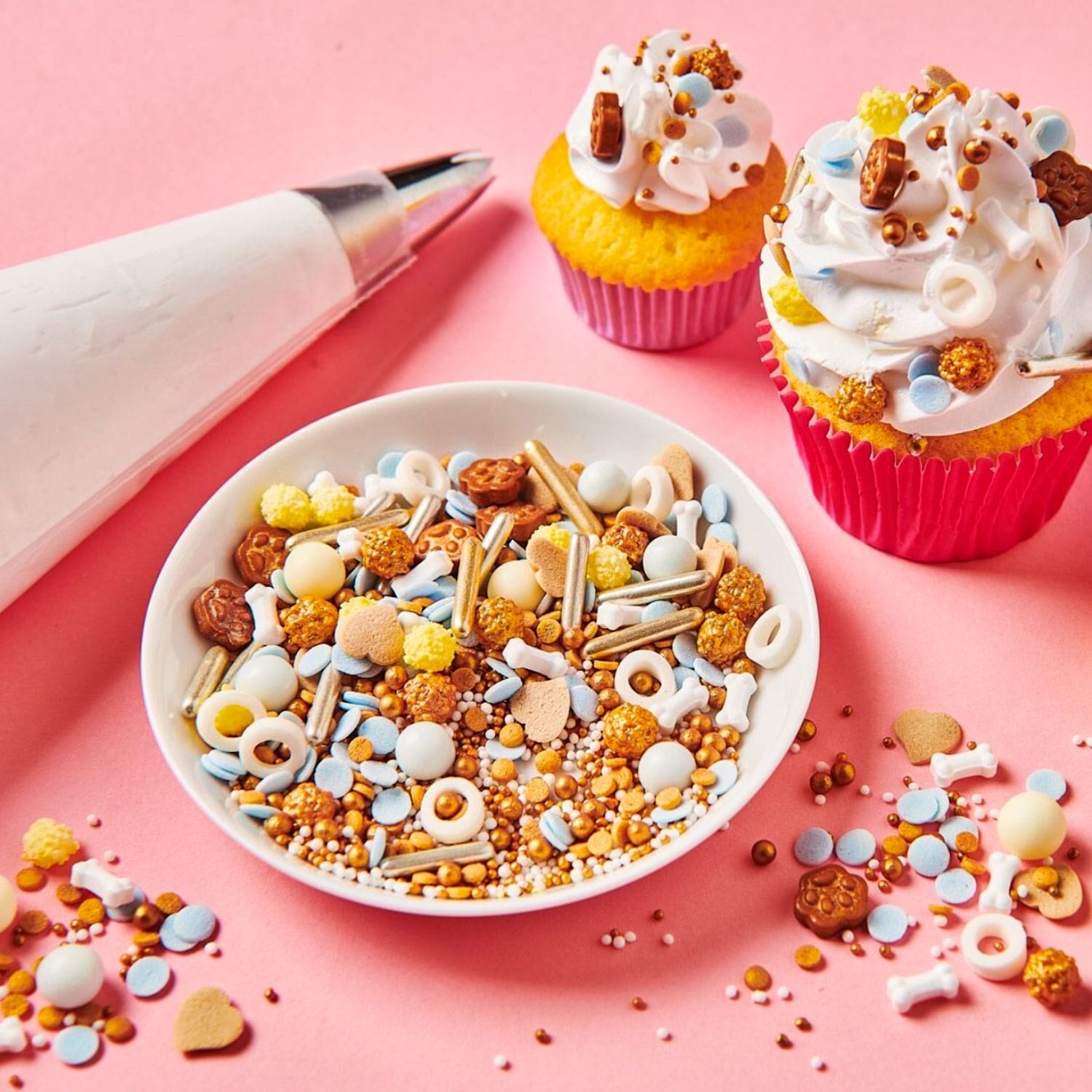 La mezcla de decoraciones incluye figuras en 3D (huellas, huesos y aros), perlas, nonpareils, mimosas, fichas planas y palitos de azúcar XL.
