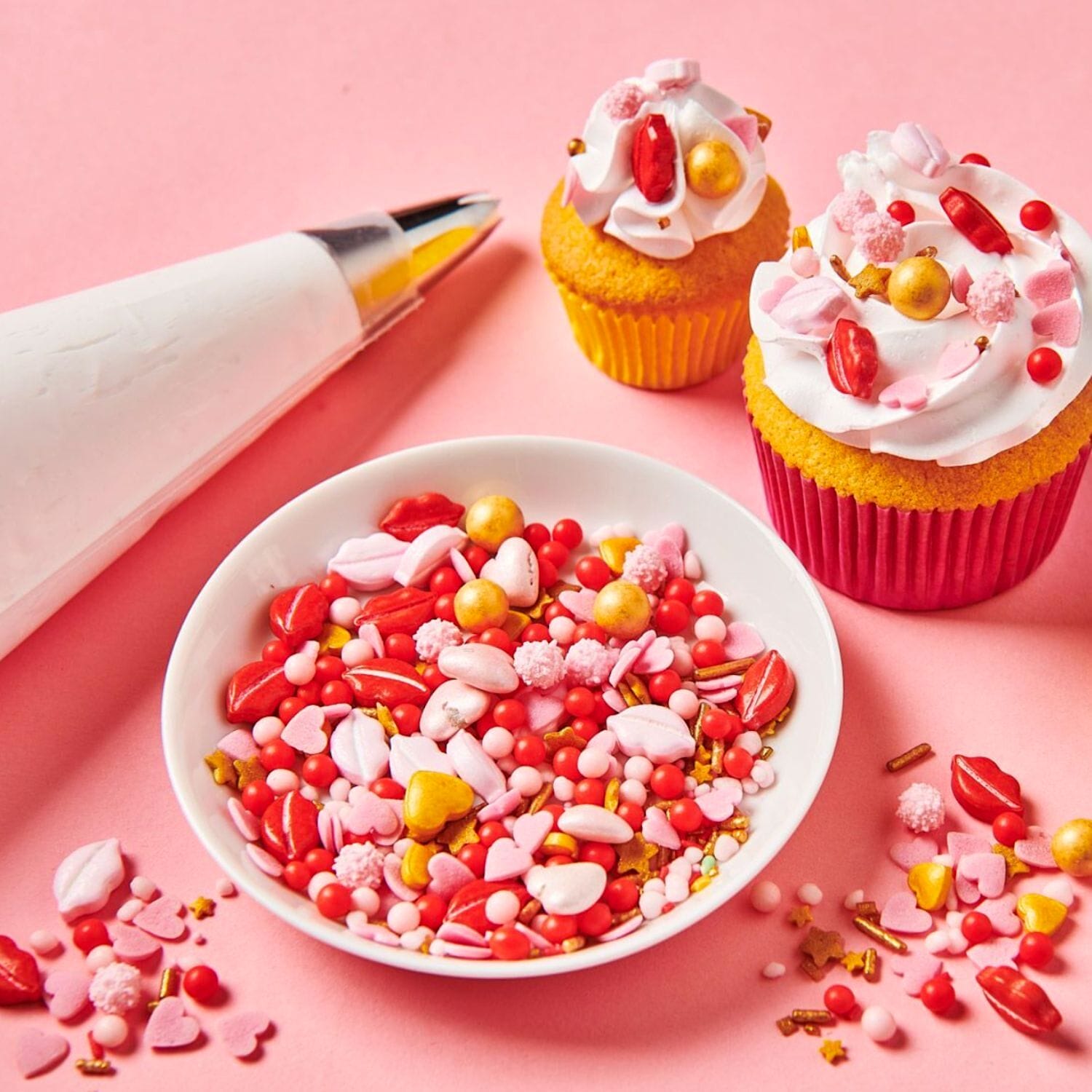 La mezcla de decoraciones incluye figuras en 3D (labios y corazones), bolas, perlas, nonpareils, mimosas, estrellas, corazones, fichas planas y palitos de azúcar.