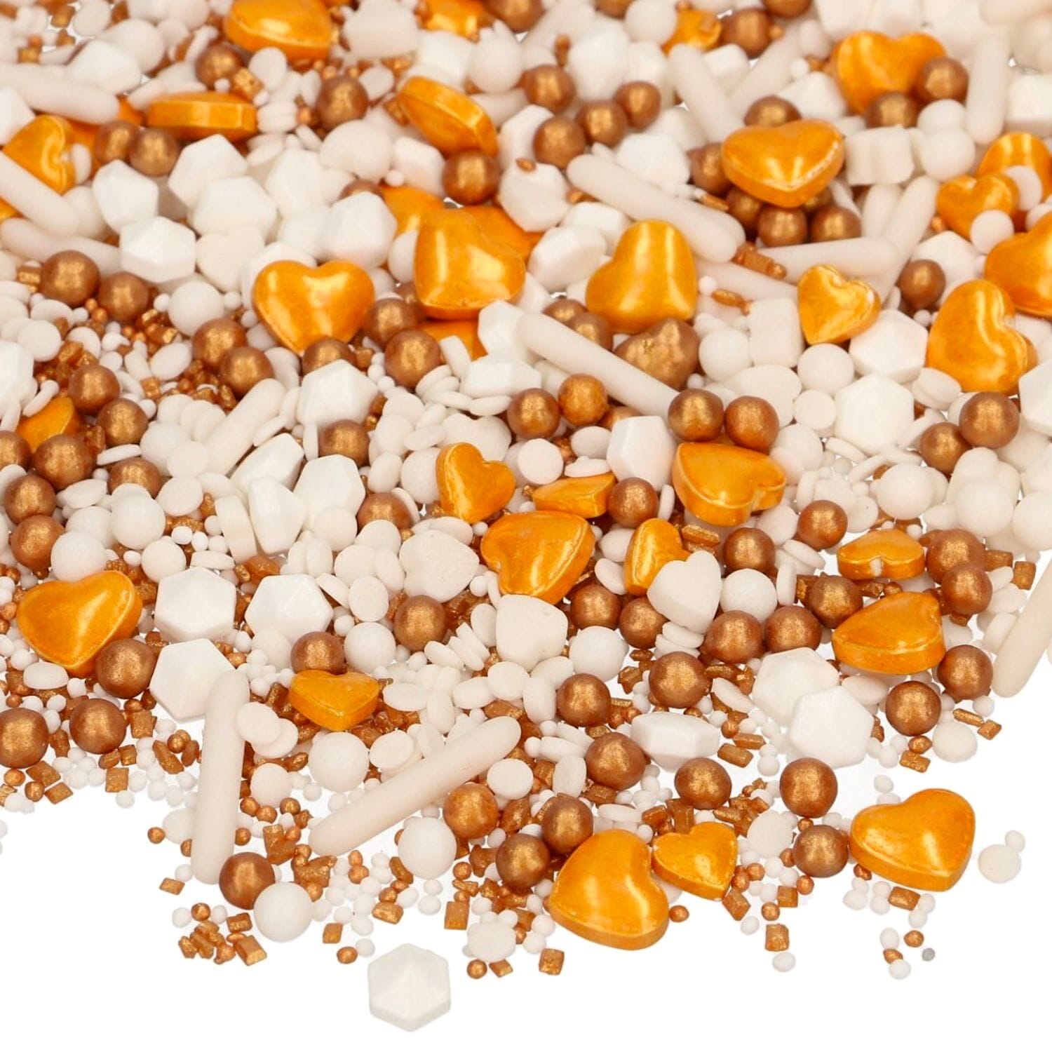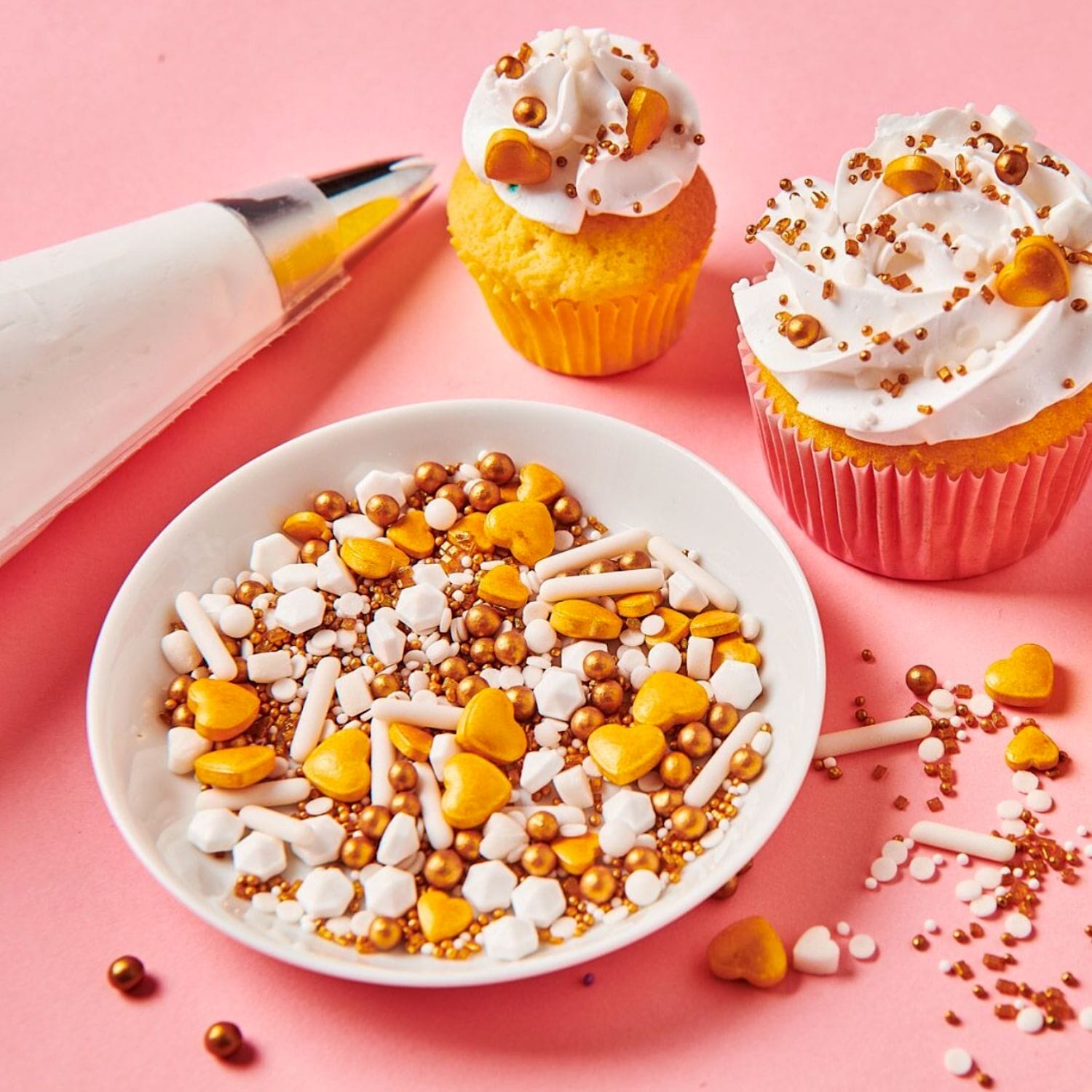 La mezcla de decoraciones incluye figuras en 3D (corazones y diamantes), perlas, nonpareils, fichas planas, corazones y palitos de azúcar XL.