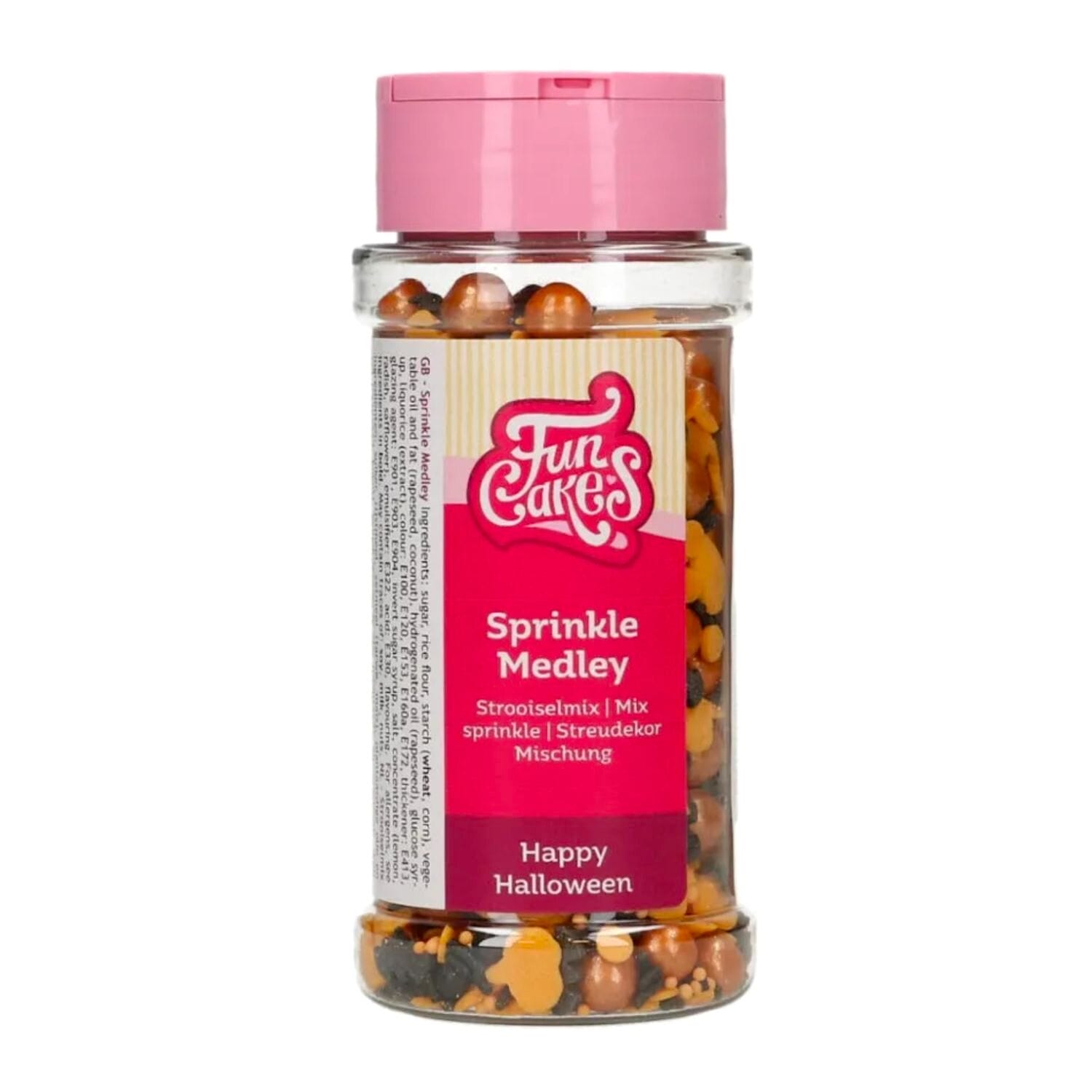 La mezcla incluye nonpareils negros y naranjas, fideos de azúcar negros, fichas planas y calabazas naranjas, murciélagos negros, perlas negras y naranja metalizado.
