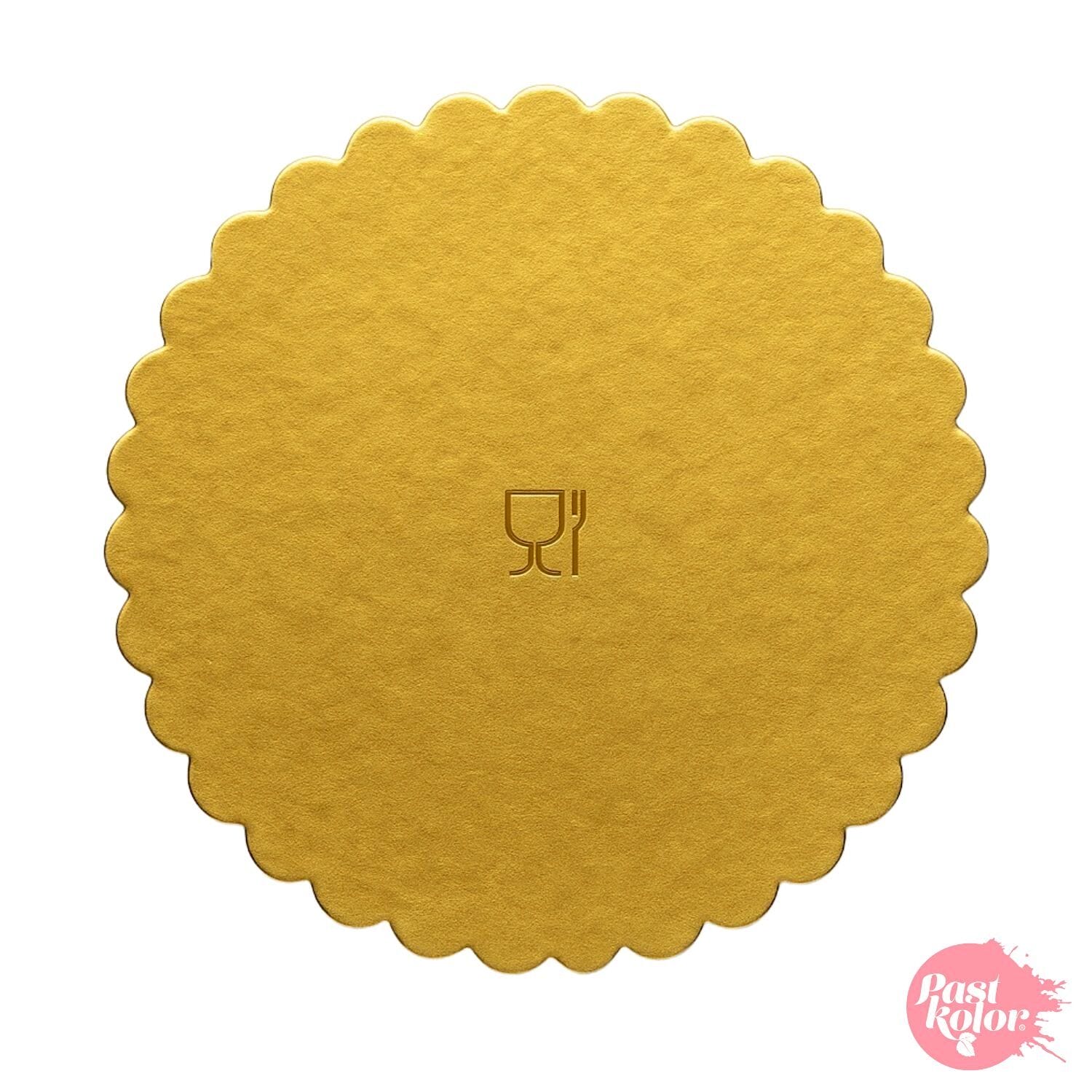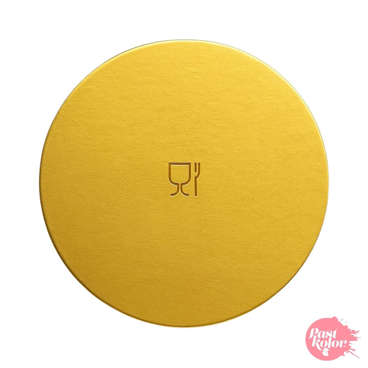 Base de apresentação para pastelaria e confeitaria, com um elegante acabamento dourado brilhante.