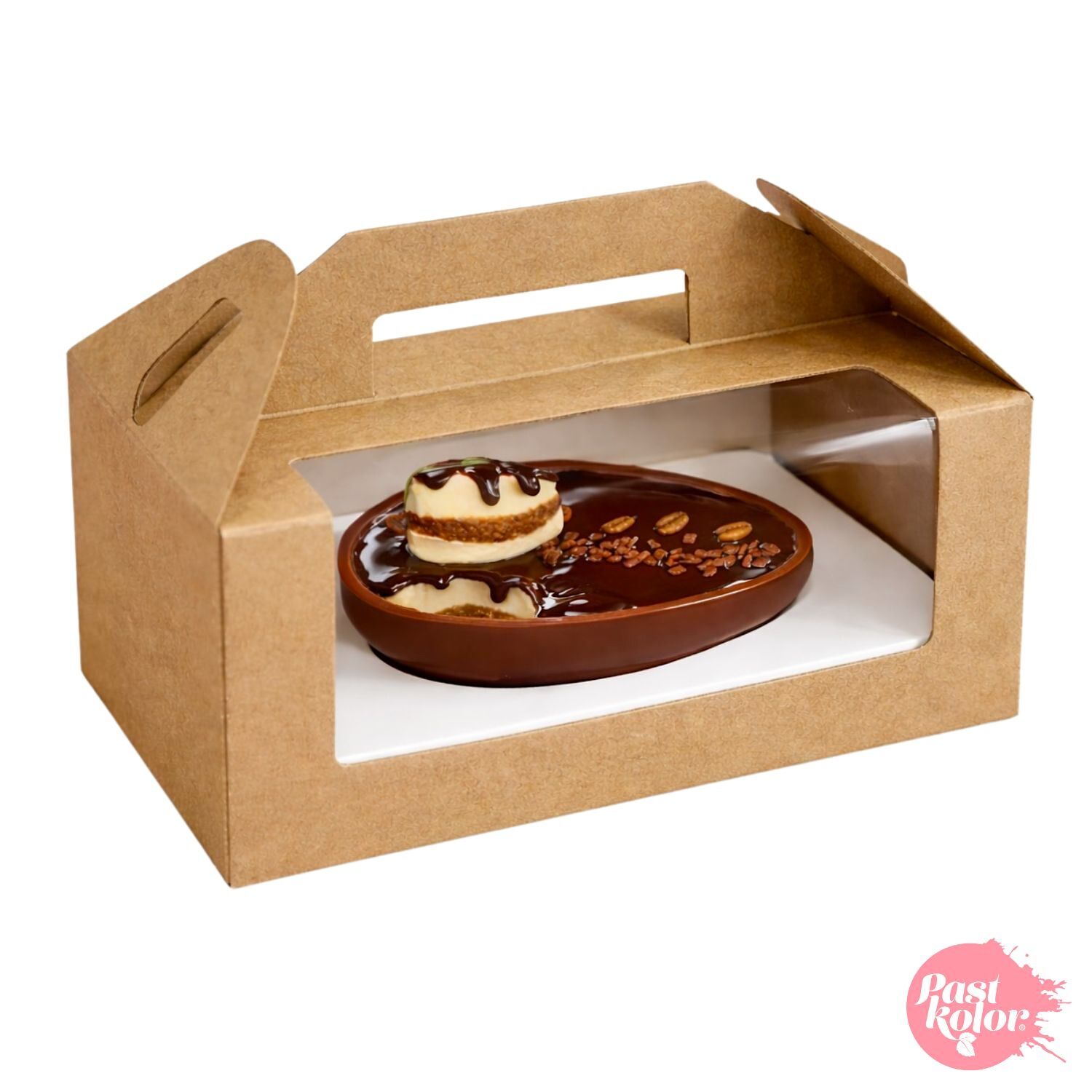 Caixa alimentar em cartão com janela transparente, ideal para a apresentação e venda de ovos de chocolate recheados, produtos de pastelaria artesanal e criações gourmet. O seu design elegante e premium permite expor o produto sem necessidade de abrir a embalagem.
