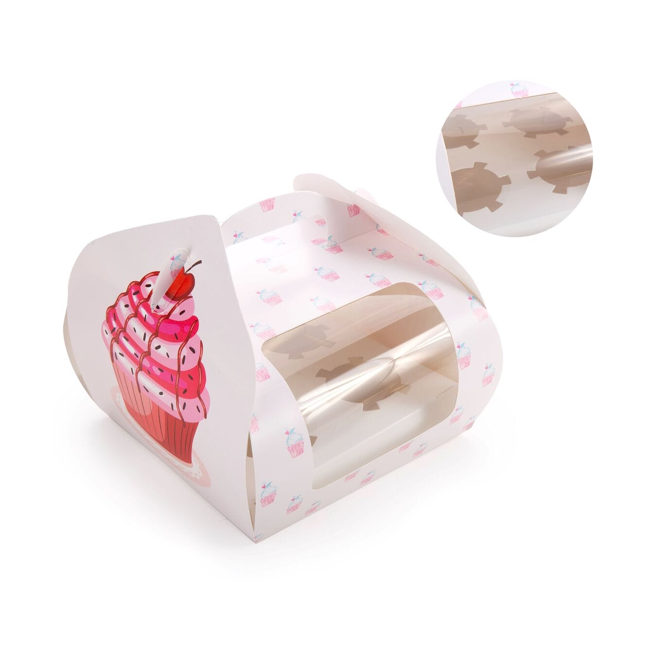 Caixa de cartão com janela para 4 cupcakes, com um desenho bonito e engraçado em cor-de-rosa.