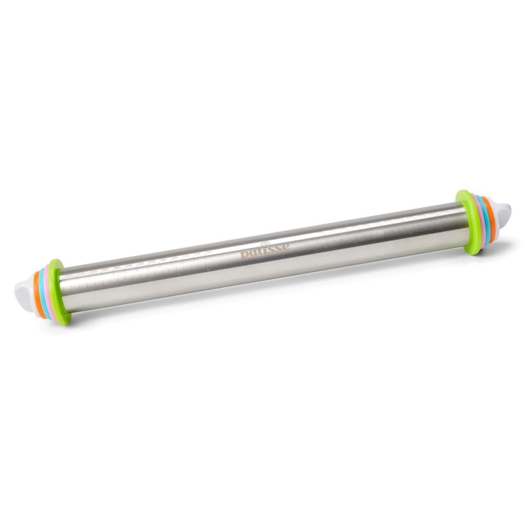 Rolo de aço inoxidável da Patisse, com anéis espaçadores de diferentes tamanhos que nos permitem ajustar a espessura da massa de forma fácil e uniforme.