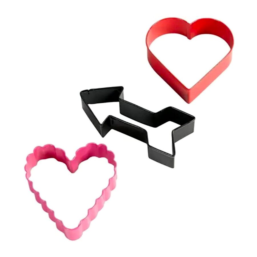 O conjunto contém 3 cortadores com a forma de um coração simples, um coração com ondas e uma seta.