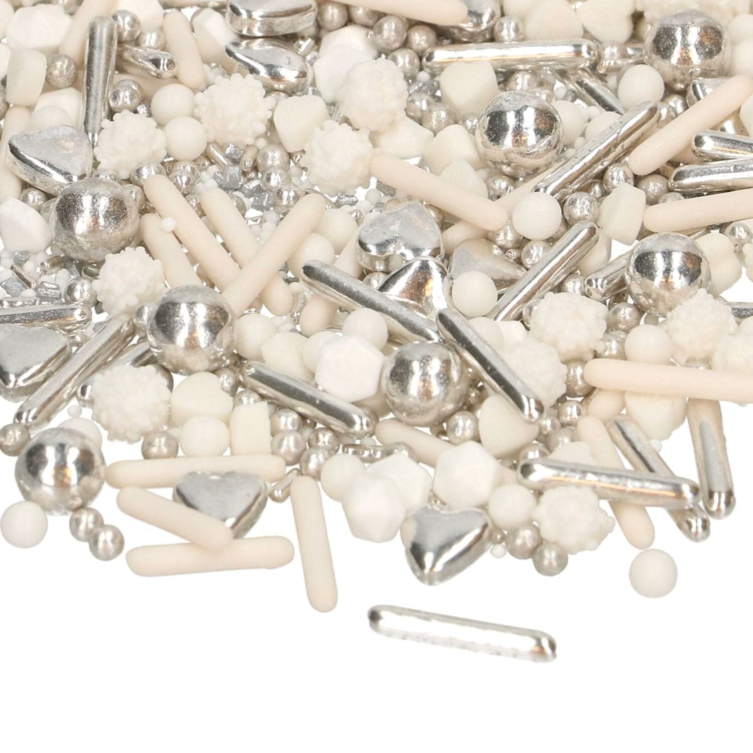 A mistura de decorações inclui figuras 3D (corações e diamantes), pérolas, mimosas, doces não-pareis, noodles e palitos de doces extragrandes.