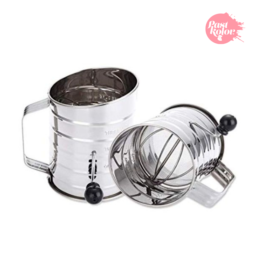 A peneira profissional projetada na forma de jarro com alça é fornecida com uma manivela que, quando girada, ativa o agitador de fio duplo, peneirando os ingredientes através de uma malha fina sem desperdiçar seu conteúdo. Deste modo, areja os ingredientes e evita impurezas e caroços, dando delicadeza à massa que produz. Feito de aço inoxidável.