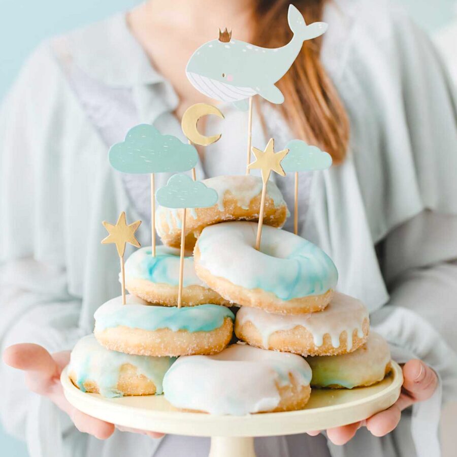 Conjunto de 7 topos da PartyDeco (estrelas, nuvens, lua e baleia), perfeitos para decorar os nossos cupcakes.